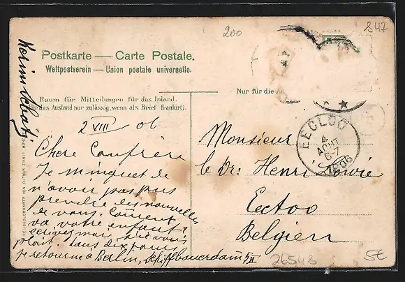 alte Ansichtskarte, gelaufen, Briefmarke entfernt, rückseitig Oberflächenschaden, Eckknicke re., guter Zustand