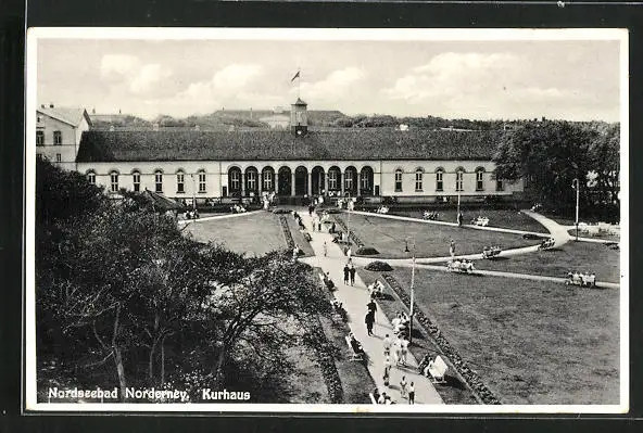 AK Norderney / Nordsee, Kurhaus, Gäste auf der Promenade