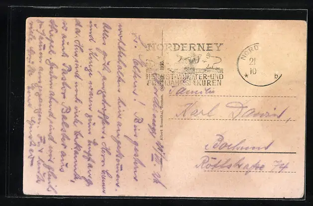 Personenbezogene Daten auf der Rückseite der Karte wurden durch blauen Textmarker unkenntlich gemacht. Die blauen Stellen sind auf die Vorderseite durchgeweicht und wirken sich negativ auf das Postkartenfoto aus