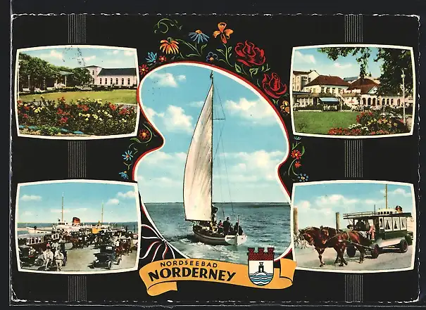 AK Norderney, Pferdekutsche, Hafen, Segelboot