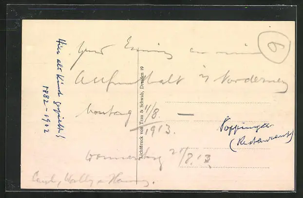 Personenbezogene Daten auf der Rückseite der Karte wurden durch blauen Textmarker unkenntlich gemacht. Die blauen Stellen sind auf die Vorderseite durchgeweicht und wirken sich negativ auf das Postkartenfoto aus