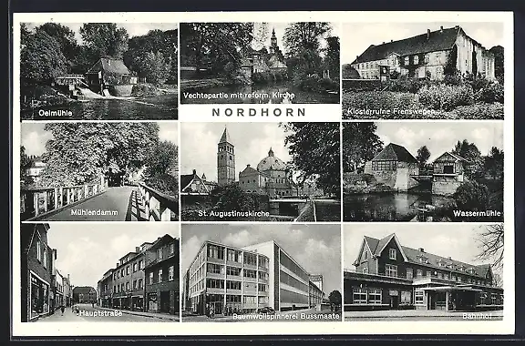 AK Nordhorn, Oelmühle, Mühlendamm, Hauptstrasse, St. Augustinuskirche, Vechtepartie