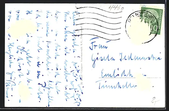 Personenbezogene Daten auf der Rückseite der Karte wurden durch blauen Textmarker unkenntlich gemacht. Die blauen Stellen sind auf die Vorderseite durchgeweicht und wirken sich negativ auf das Postkartenfoto aus