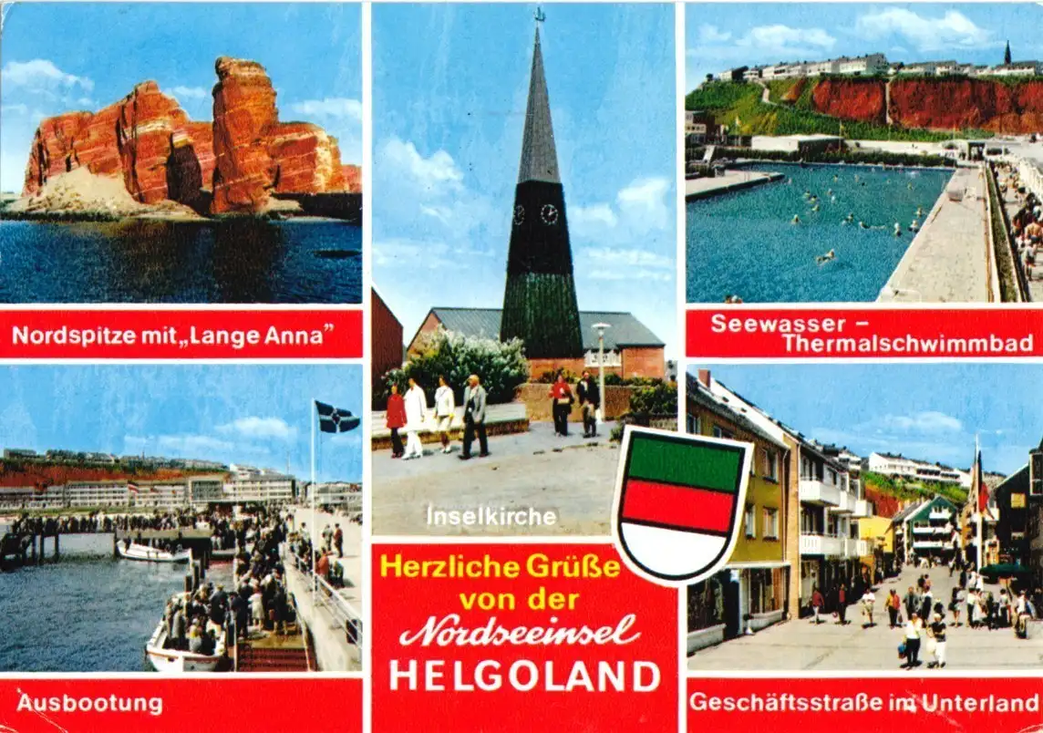 Ansichtskarte Nordseeinsel Helgoland fünf Abb. - Nordspitze, Seewasser-Thermalschwimmbad, Inselkirche, Ausbootung, Geschäftsstr. im Unterland Erhaltung I-II, Beförderungsspuren postalisch gelaufen, gestempelt: Helgoland, 1.8.78 Verlag: Schöning & Co + Gebrüder Schmidt, Lübeck