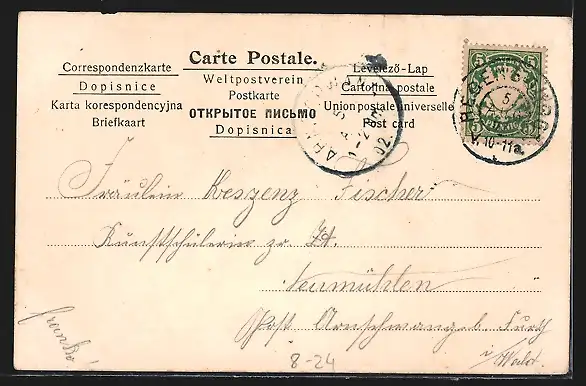 Personenbezogene Daten auf der Rückseite der Karte wurden durch blauen Textmarker unkenntlich gemacht. Die blauen Stellen sind auf die Vorderseite durchgeweicht und wirken sich negativ auf das Postkartenfoto aus