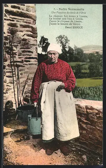 AK Normandie, Ältere Bäuerin mit Weintrauben