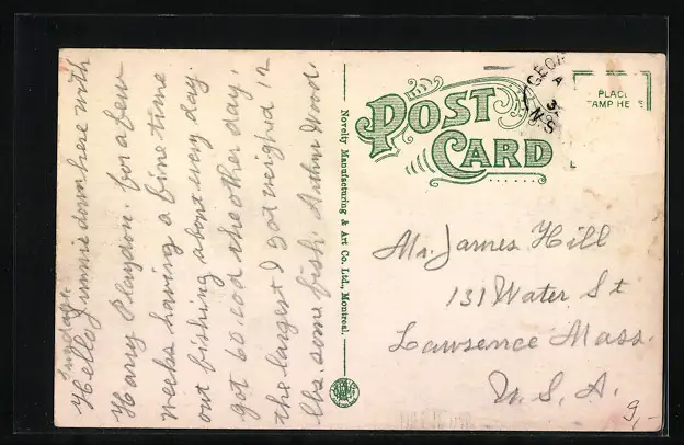 Personenbezogene Daten auf der Rückseite der Karte wurden durch blauen Textmarker unkenntlich gemacht. Die blauen Stellen sind auf die Vorderseite durchgeweicht und wirken sich negativ auf das Postkartenfoto aus
