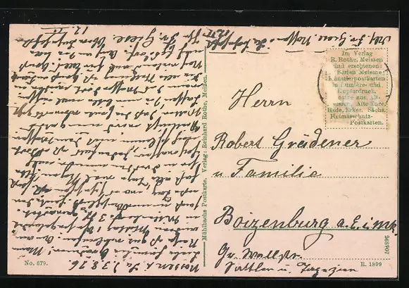 Personenbezogene Daten auf der Rückseite der Karte wurden durch blauen Textmarker unkenntlich gemacht. Die blauen Stellen sind auf die Vorderseite durchgeweicht und wirken sich negativ auf das Postkartenfoto aus