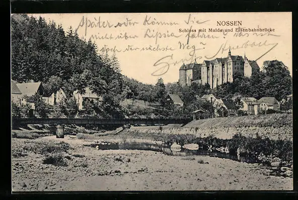 AK Nossen, Schloss mit Mulde und Eisenbahnbrücke