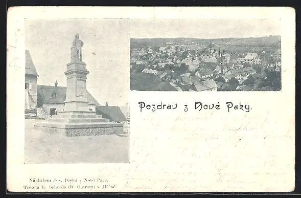 AK Nova Paka, Denkmal und Ortsansicht aus der Vogelschau
