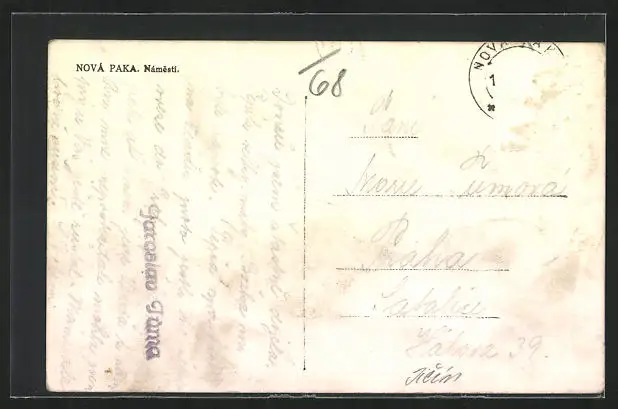 Personenbezogene Daten auf der Rückseite der Karte wurden durch blauen Textmarker unkenntlich gemacht. Die blauen Stellen sind auf die Vorderseite durchgeweicht und wirken sich negativ auf das Postkartenfoto aus