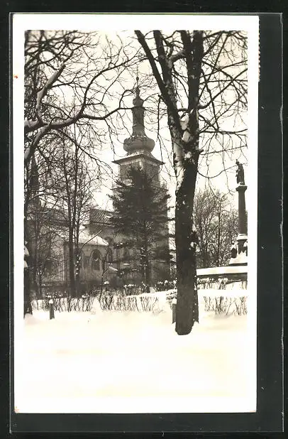 AK Nové Metso na Morave, Ortspartie mit Kirche im Winter