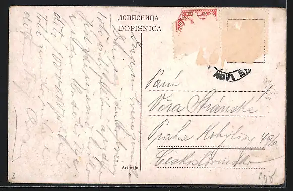 alte Ansichtskarte, gelaufen, Briefmarke entfernt, rückseitig Oberflächenschaden, guter Zustand
