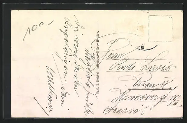 Personenbezogene Daten auf der Rückseite der Karte wurden durch blauen Textmarker unkenntlich gemacht. Die blauen Stellen sind auf die Vorderseite durchgeweicht und wirken sich negativ auf das Postkartenfoto aus