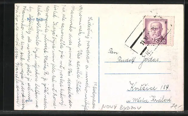 Personenbezogene Daten auf der Rückseite der Karte wurden durch blauen Textmarker unkenntlich gemacht. Die blauen Stellen sind auf die Vorderseite durchgeweicht und wirken sich negativ auf das Postkartenfoto aus