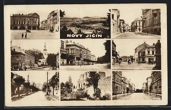 AK Nový Jicín, Ruine, Kirche, Strassenpartie