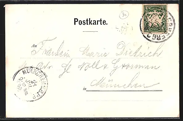 alte Ansichtskarte, gelaufen 1899, Stempelspur, guter Zustand