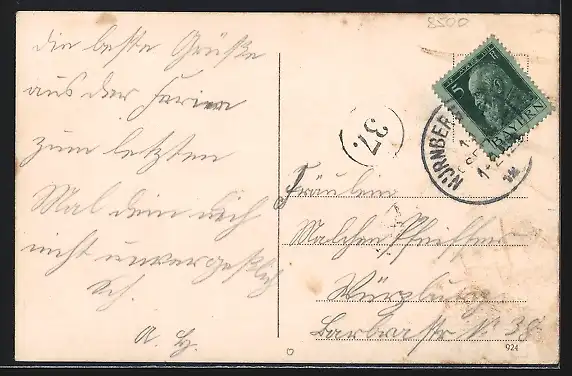 Personenbezogene Daten auf der Rückseite der Karte wurden durch blauen Textmarker unkenntlich gemacht. Die blauen Stellen sind auf die Vorderseite durchgeweicht und wirken sich negativ auf das Postkartenfoto aus