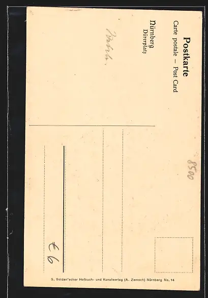Personenbezogene Daten auf der Rückseite der Karte wurden durch blauen Textmarker unkenntlich gemacht. Die blauen Stellen sind auf die Vorderseite durchgeweicht und wirken sich negativ auf das Postkartenfoto aus