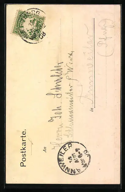 Personenbezogene Daten auf der Rückseite der Karte wurden durch blauen Textmarker unkenntlich gemacht. Die blauen Stellen sind auf die Vorderseite durchgeweicht und wirken sich negativ auf das Postkartenfoto aus