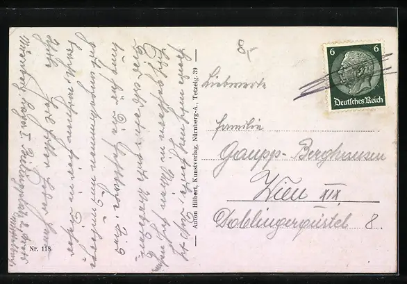 Personenbezogene Daten auf der Rückseite der Karte wurden durch blauen Textmarker unkenntlich gemacht. Die blauen Stellen sind auf die Vorderseite durchgeweicht und wirken sich negativ auf das Postkartenfoto aus