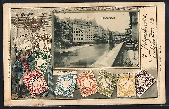 AK Nürnberg, Karlsbrücke im Briefmarken-Passepartout mit Wappen