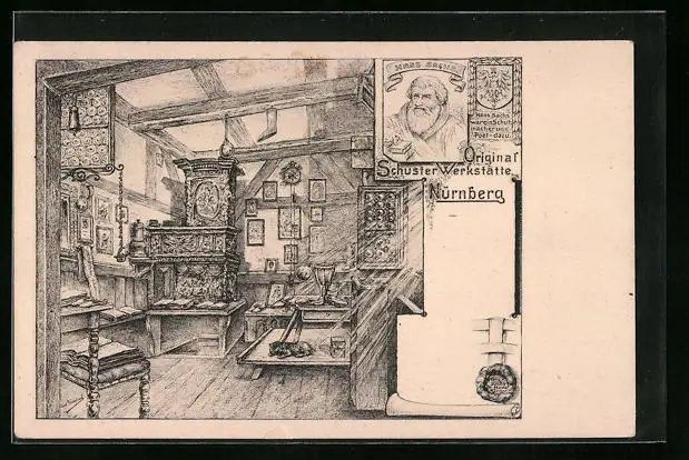 AK Nürnberg, Original Schuster-Werkstätte, Porträt Hans Sachs