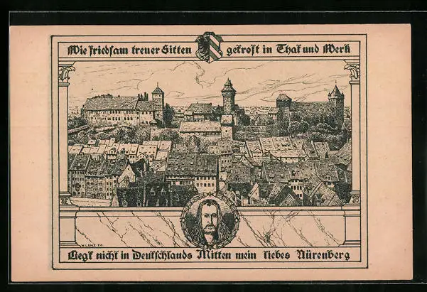 AK Nürnberg, Ortsansicht mit Burg und Sinnspruch