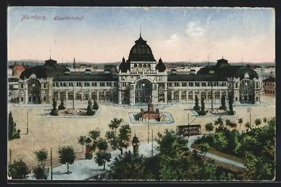 AK Nürnberg, Strassenbahn vor dem Hauptbahnhof