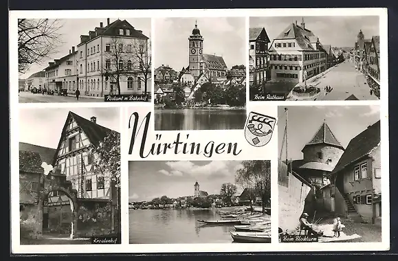AK Nürtingen, Postamt mit Bahnhof, Kroatenhof, Rathaus, Blockturm
