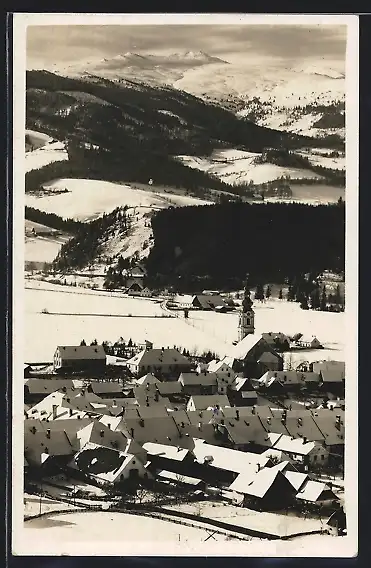 AK Obdach, Ortsansicht mit Bergen im Winter