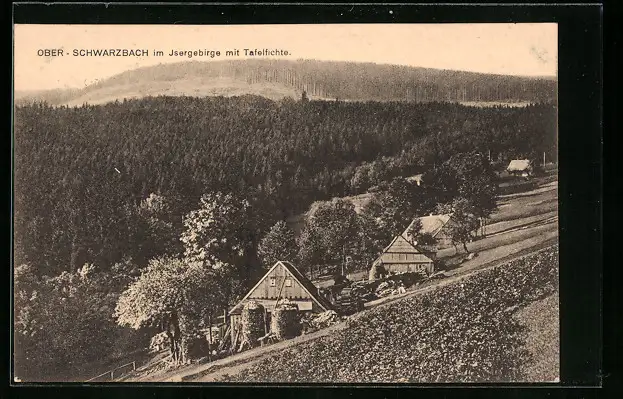 AK Ober-Schwarzbach im Isergebirge, Ortsansicht mit Tafelfichte