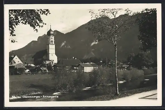 AK Oberammergau, Ammerpartie mit Kirche