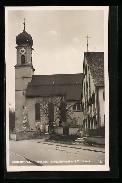 AK Oberammergau, Pfarrkirche, Kriegerdenkmal und Forsthaus