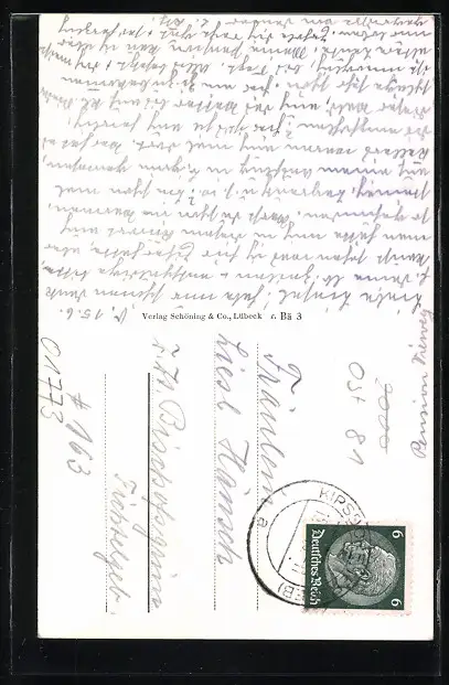 Personenbezogene Daten auf der Rückseite der Karte wurden durch blauen Textmarker unkenntlich gemacht. Die blauen Stellen sind auf die Vorderseite durchgeweicht und wirken sich negativ auf das Postkartenfoto aus