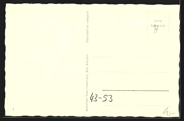Personenbezogene Daten auf der Rückseite der Karte wurden durch blauen Textmarker unkenntlich gemacht. Die blauen Stellen sind auf die Vorderseite durchgeweicht und wirken sich negativ auf das Postkartenfoto aus