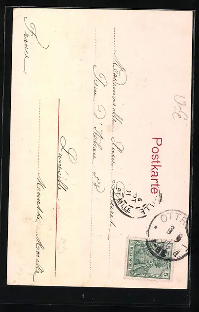 Personenbezogene Daten auf der Rückseite der Karte wurden durch blauen Textmarker unkenntlich gemacht. Die blauen Stellen sind auf die Vorderseite durchgeweicht und wirken sich negativ auf das Postkartenfoto aus