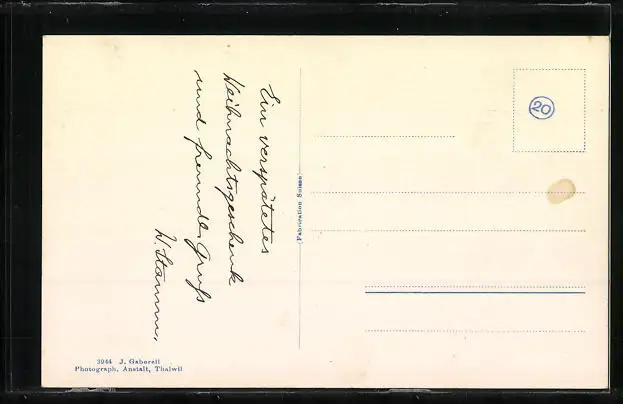 Personenbezogene Daten auf der Rückseite der Karte wurden durch blauen Textmarker unkenntlich gemacht. Die blauen Stellen sind auf die Vorderseite durchgeweicht und wirken sich negativ auf das Postkartenfoto aus