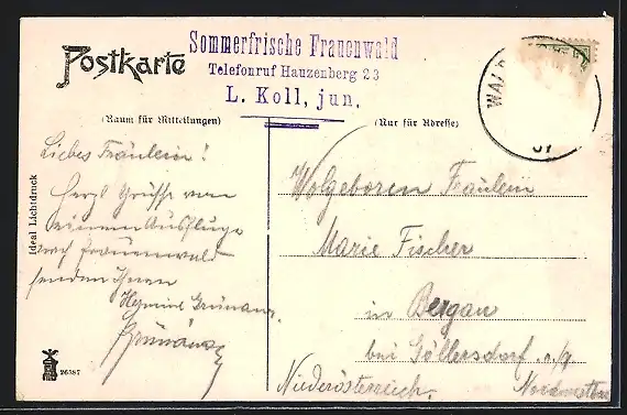 Personenbezogene Daten auf der Rückseite der Karte wurden durch blauen Textmarker unkenntlich gemacht. Die blauen Stellen sind auf die Vorderseite durchgeweicht und wirken sich negativ auf das Postkartenfoto aus