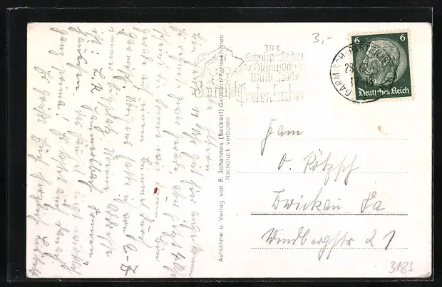 Personenbezogene Daten auf der Rückseite der Karte wurden durch blauen Textmarker unkenntlich gemacht. Die blauen Stellen sind auf die Vorderseite durchgeweicht und wirken sich negativ auf das Postkartenfoto aus