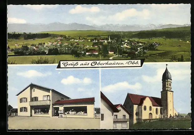 AK Oberhausen /Obb., Ortsansicht, Geschäft und Kirche