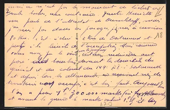Personenbezogene Daten auf der Rückseite der Karte wurden durch blauen Textmarker unkenntlich gemacht. Die blauen Stellen sind auf die Vorderseite durchgeweicht und wirken sich negativ auf das Postkartenfoto aus