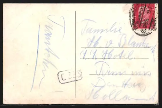 Personenbezogene Daten auf der Rückseite der Karte wurden durch blauen Textmarker unkenntlich gemacht. Die blauen Stellen sind auf die Vorderseite durchgeweicht und wirken sich negativ auf das Postkartenfoto aus