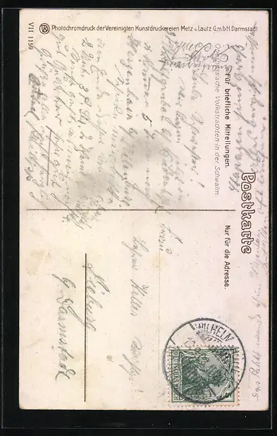 Personenbezogene Daten auf der Rückseite der Karte wurden durch blauen Textmarker unkenntlich gemacht. Die blauen Stellen sind auf die Vorderseite durchgeweicht und wirken sich negativ auf das Postkartenfoto aus