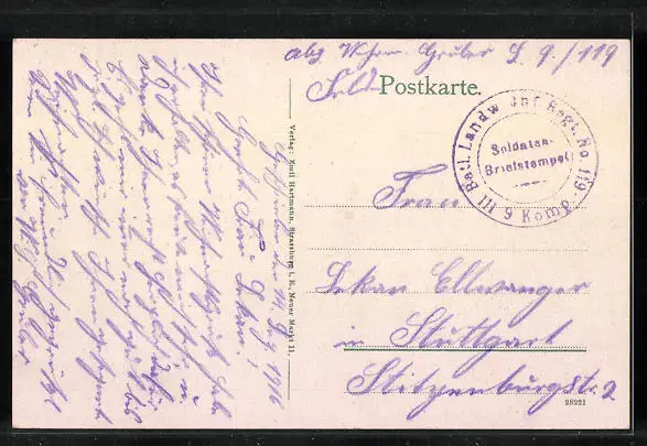 Personenbezogene Daten auf der Rückseite der Karte wurden durch blauen Textmarker unkenntlich gemacht. Die blauen Stellen sind auf die Vorderseite durchgeweicht und wirken sich negativ auf das Postkartenfoto aus
