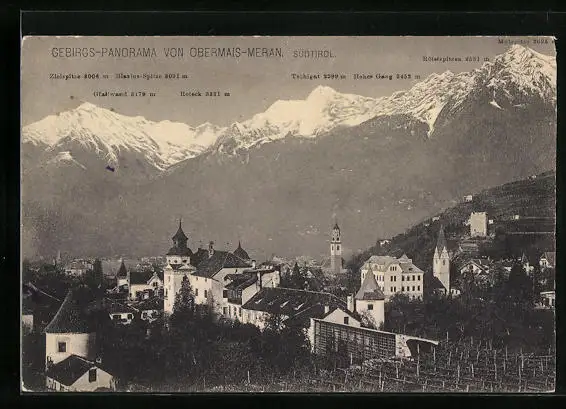 AK Obermais-Meran, Totale mit Gebirgspanorama