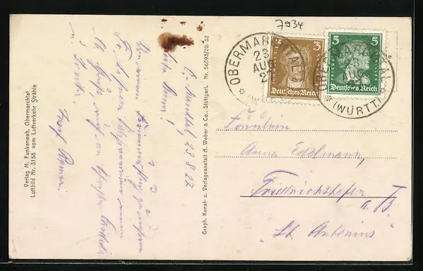 Personenbezogene Daten auf der Rückseite der Karte wurden durch blauen Textmarker unkenntlich gemacht. Die blauen Stellen sind auf die Vorderseite durchgeweicht und wirken sich negativ auf das Postkartenfoto aus