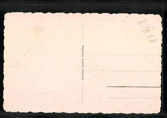 Personenbezogene Daten auf der Rückseite der Karte wurden durch blauen Textmarker unkenntlich gemacht. Die blauen Stellen sind auf die Vorderseite durchgeweicht und wirken sich negativ auf das Postkartenfoto aus