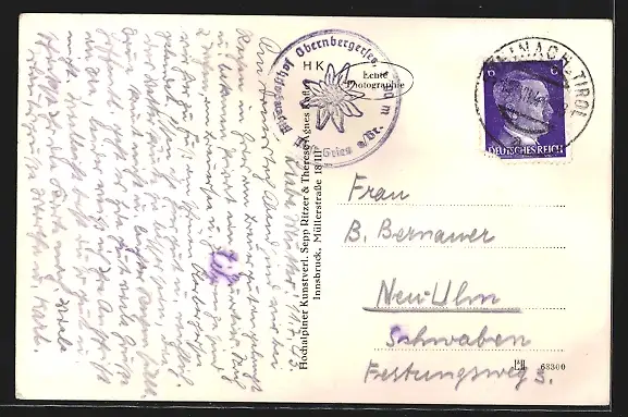 Personenbezogene Daten auf der Rückseite der Karte wurden durch blauen Textmarker unkenntlich gemacht. Die blauen Stellen sind auf die Vorderseite durchgeweicht und wirken sich negativ auf das Postkartenfoto aus