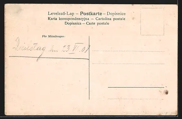 Personenbezogene Daten auf der Rückseite der Karte wurden durch blauen Textmarker unkenntlich gemacht. Die blauen Stellen sind auf die Vorderseite durchgeweicht und wirken sich negativ auf das Postkartenfoto aus